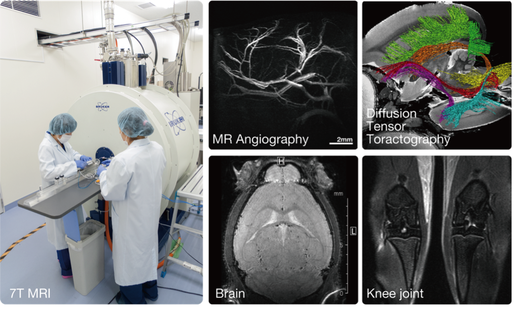 実中研では、超高磁場磁気共鳴画像装置(MRI)、マイクロX線CTを用いたin vivoイメージングを行っています。ヒトと共通の評価手法を用いることで、非侵襲かつ経時的な変化を捉えることができ、医学研究への速やかな橋渡し研究を行うことができます。最先端研究設備を用いた共同研究・受託解析・技術指導など受け付けております、お気軽にお問い合わせください。