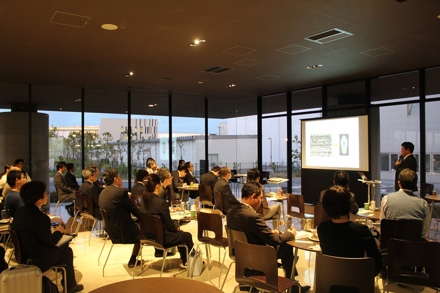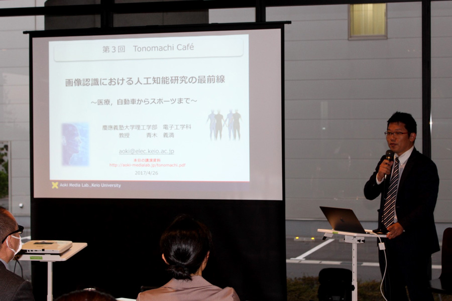 今回は、川崎生命科学・環境研究センター(LiSE)の交流ラウンジにて開催いたしました。人や動物を画像認識する仕組みから、動画のシーン認識、医学部との共同研究により開発した脊柱側弯症のAI診断、スポーツ映像を活用した行動認識など、多方面への応用についてご講演いただきました。面白い動画もご用意いただき、和やかに進行しつつも、鋭い質問が飛び交い、予定人数を上回る31名の参加者との活発な議論が行われました。