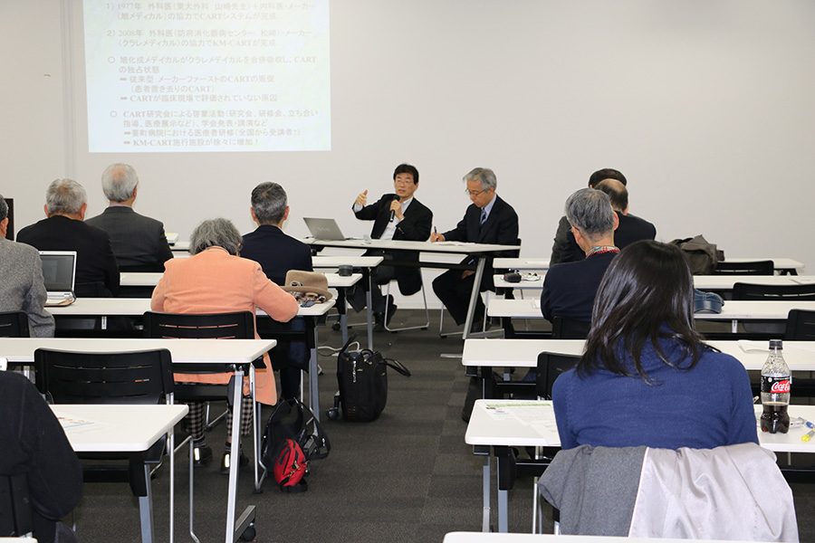 11月28日にスタートしました「ヘルスケア・イノベーションの本質をとらえる」~『最先端』に惑わされない研究開発と地域社会構築に向けて~の第4回セミナーを開講いたしました。第4回の内容としては「よく生きる」~現場医師がひとりで歩んだ医療機器開発30年間の隘路 と題し、第1回にモデレーターをお努めいただいたKISTEC人材育成エキスパート、一般社団法人日本医工ものづくりコモンズ副理事長、慶應義塾大学名誉教授の谷下 一夫氏より本日の講師である医療法人社団愛語会 要町病院 腹水治療センター長 医師の松崎圭祐氏をご紹介いただきました。松崎氏からは、ご自身が長年力を注いでこられた腹水治療に関しての現状とCARTにおける医工産学連携におけるポイントを熱くお話頂きました。