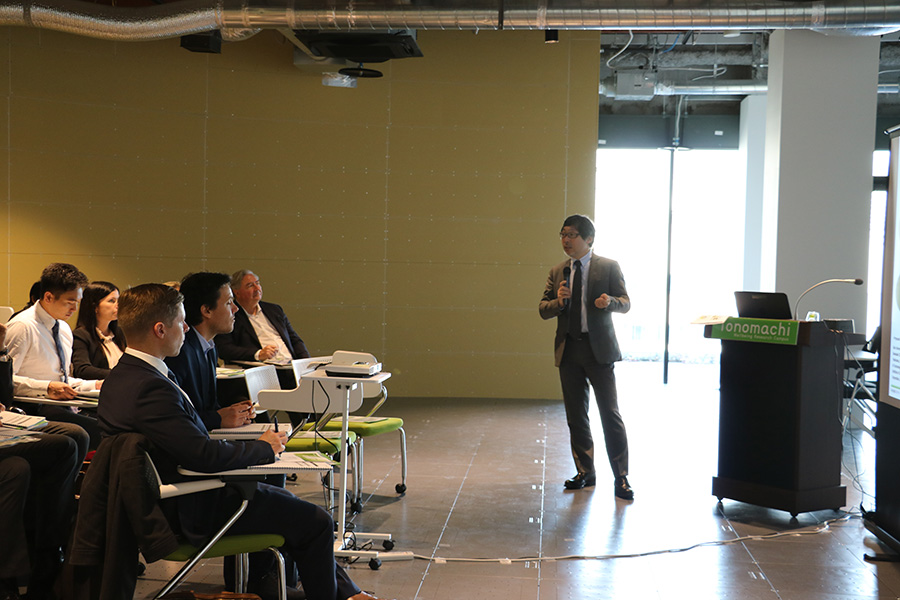一行は事務局・通訳4名を含む16名の参加者で、1.甲田岳生川崎市産業振興財団産業支援部新産業振興課担当課長(リサーチコンプレックス担当)によるリサーチコンプレックス推進プログラムの紹介、2.慶應義塾大学医学部整形外科学教室の大川原 洋樹研究員による中村雅也教授のサイバーダイン社との共同研究内容の紹介を行いました。