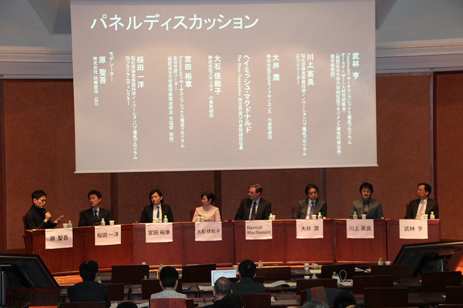 当日は濵口道成理事長による開会挨拶の後、特別講演として日本医療研究開発機構理事長の末松誠氏による招待講演を頂き、特別講演として株式会社メディヴァ代表取締役の大石佳能子氏、The Diary Corporation,CEO and FounderのMr.Hamish MacDonald、株式会社DeNAライフサイエンス代表取締役の大井潤氏に講演を頂きました。休憩をはさみ各推進プログラムのリーダーとして活躍されている理化学研究所医科学イノベーションハブ推進プログラム副プログラムディレクターの桜田一洋しとTonomachiリサーチコンプレックス推進プログラム基盤整備リーダーで慶應義塾大学医学部医療政策・管理学教授の宮田裕章氏によるCross Talkセッションを行い、各プログラムで推進している事業概要の解説を頂きました。その後は共催の理研AIPの取組みとして理化学研究所 革新知能統合研究センター 副センター長の上田修功氏に講演を頂きました。
