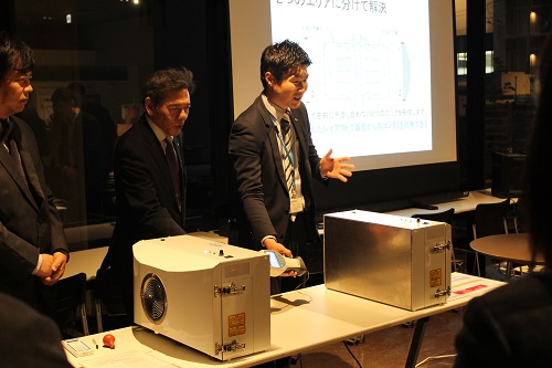 Tonomachi Cafe の講演冒頭、川崎市内企業をはじめとした企業・技術を紹介する『企業・技術紹介枠』を実施。川崎市内に営業所をもつ日本電計株式会社様と研究支援機器を取り扱う興研株式会社様より、卓上型のオープンクリーンゾーンを形成する研究支援機器について、実際の機器を使用しながら解説頂きました。コンタミが無くなっていく様子を、ご参加者も興味深くご覧になっておりました。
