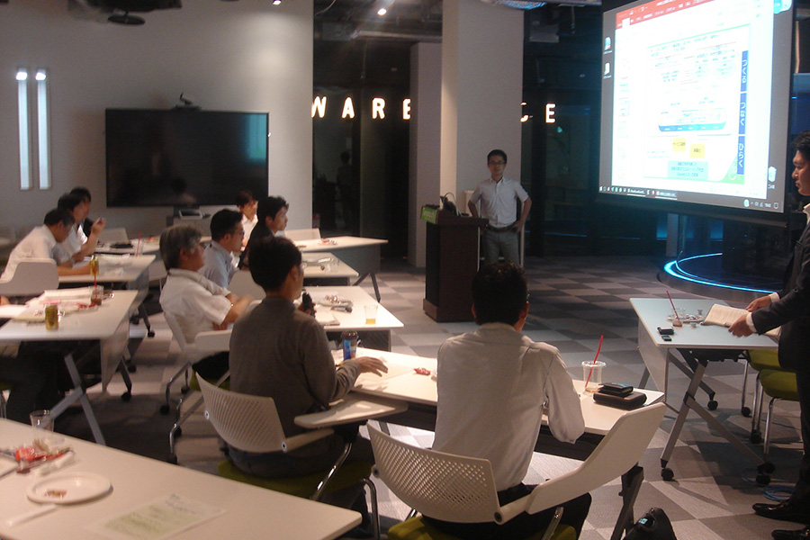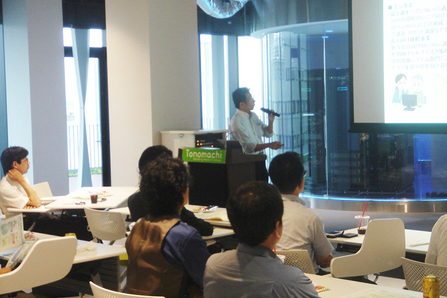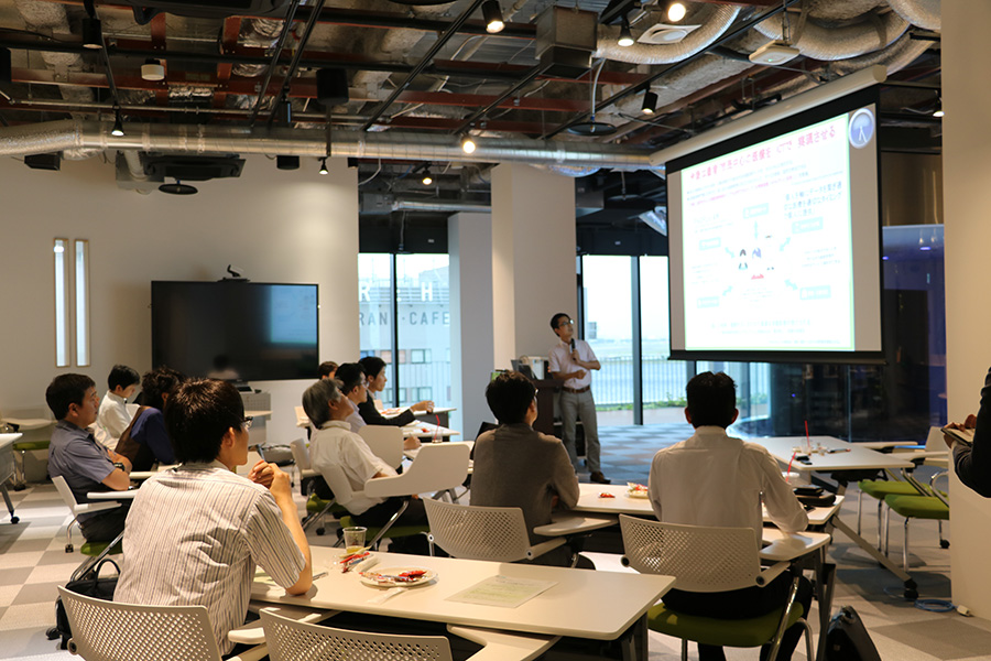 Tonomachi Cafe の講演冒頭『企業紹介枠』では、川崎市内企業である株式会社アルファメディア 小湊代表取締役から川崎市知財交流会へ参加したことを契機に開発された代返防止機能を持つ出席管理システム「かいけつ出席」や、産業振興財団ICT連携コーディネータとしての取組みについてご説明を頂きました。