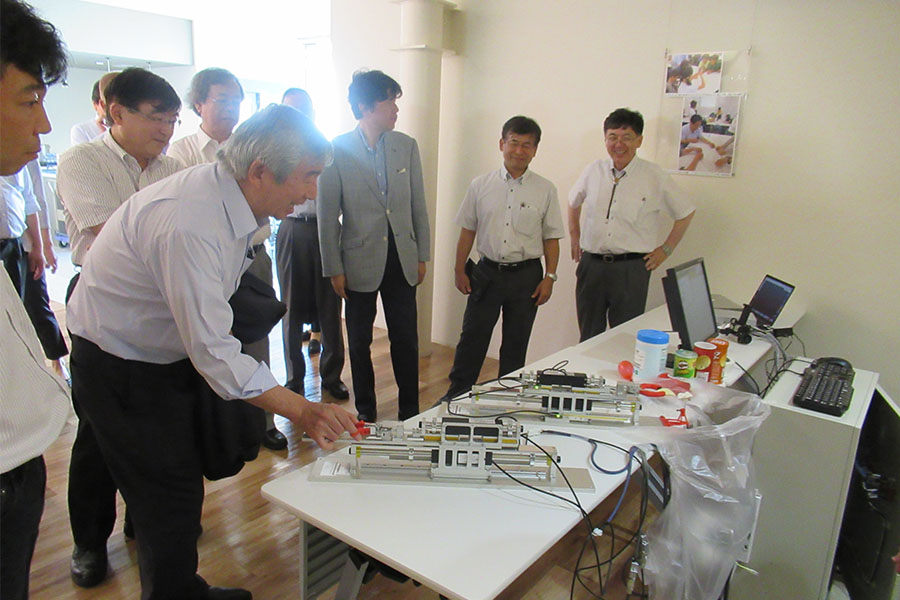 その後、国立医薬品食品衛生研究所、川崎市キングスカイフロントマネジメントセンターを視察され、神奈川県立産業技術総合研究所によるハプティクス技術の実演、慶應義塾大学医学部百寿総合研究センターの取組みを説明し、最後にエストニアのタリン大学との連携の一環として慶應義塾大学医学部医療政策管理学教室の宮田教授及び平原助教による遠隔画像でのやり取りを観ていただきました。活発な意見交換、質疑応答等を行い一定の評価をいただいたと同時に現時点での課題等のご指摘もいただきました。