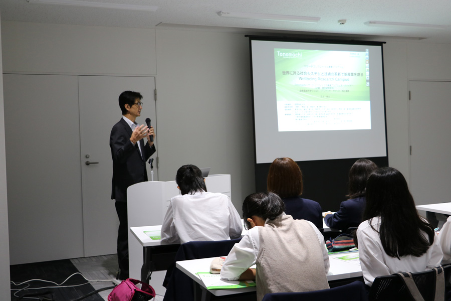 神奈川県立多摩高等学校第1学年50名の生徒さんと引率教員1名による殿町タウンキャンパスの視察が行われました。あいにくセミナールームは別の講義で使用中であったため、神奈川ライフイノベーションセンター(LiC)4階の会議室において鈴木事務長から殿町タウンキャンパスの概要について説明があった後、吉元良太リサーチコンプレックス推進プログラムオーガナイザーから同プログラムの現状と将来構想についてプレゼンテーションを行いました。その後RGB2のタウンキャンパスに移動して3階の中村雅也医学部整形外科学教授のラボでロボットスーツHALの展示を見学していただきました。