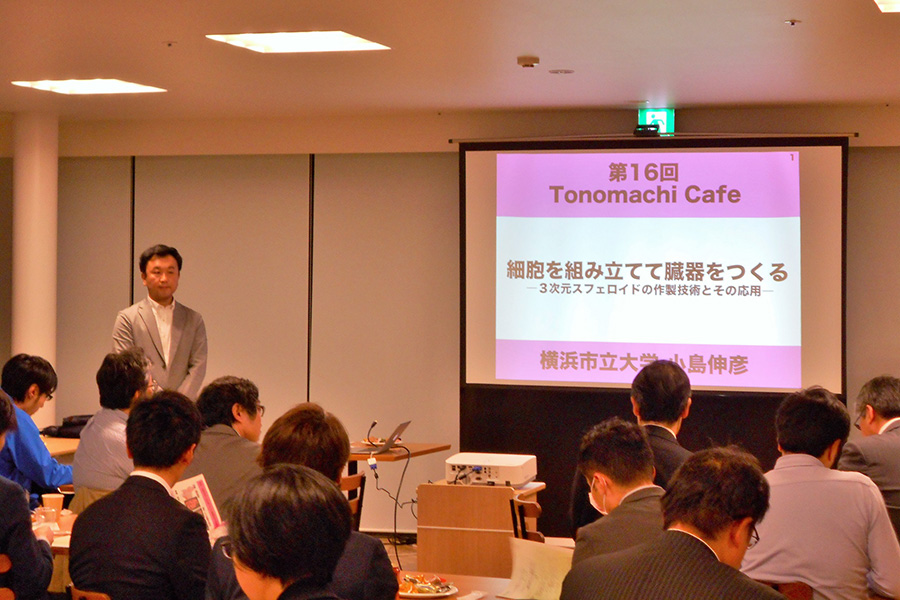 今回は横浜市立大学大学院生命ナノシステム科学研究科の小島伸彦氏にご登壇をいただき、光ピンセット・細胞用接着剤・マイクロ流体デバイスによる臓器づくりの試みや、スフェロイド内部に微細構造をつくり込む技術についてお話しいただきました。自由な発想によって臓器設計技術を開発する考えに、参加者からも多くの質問が出ておりました。