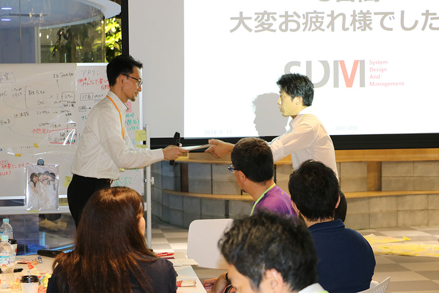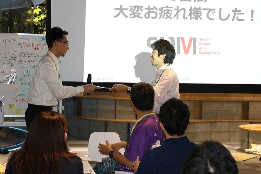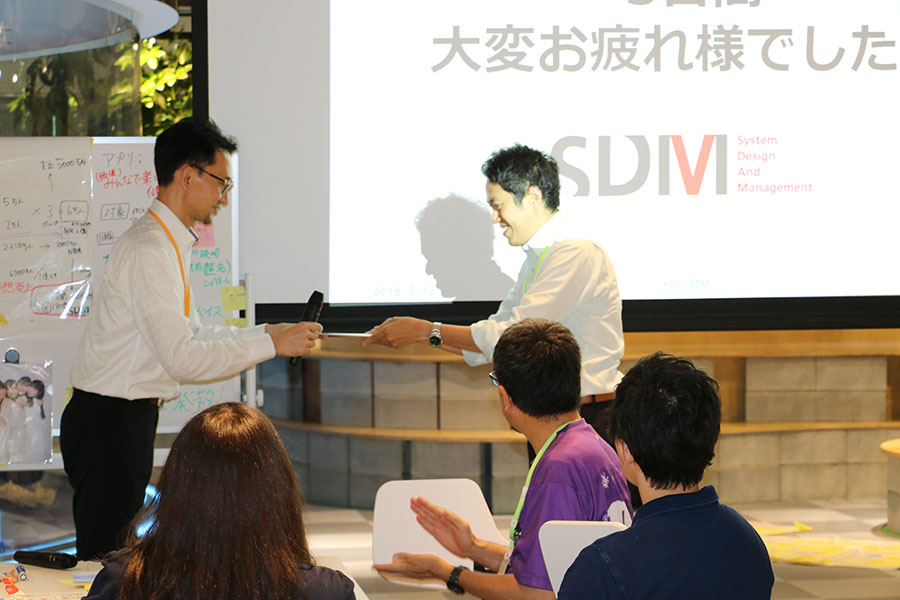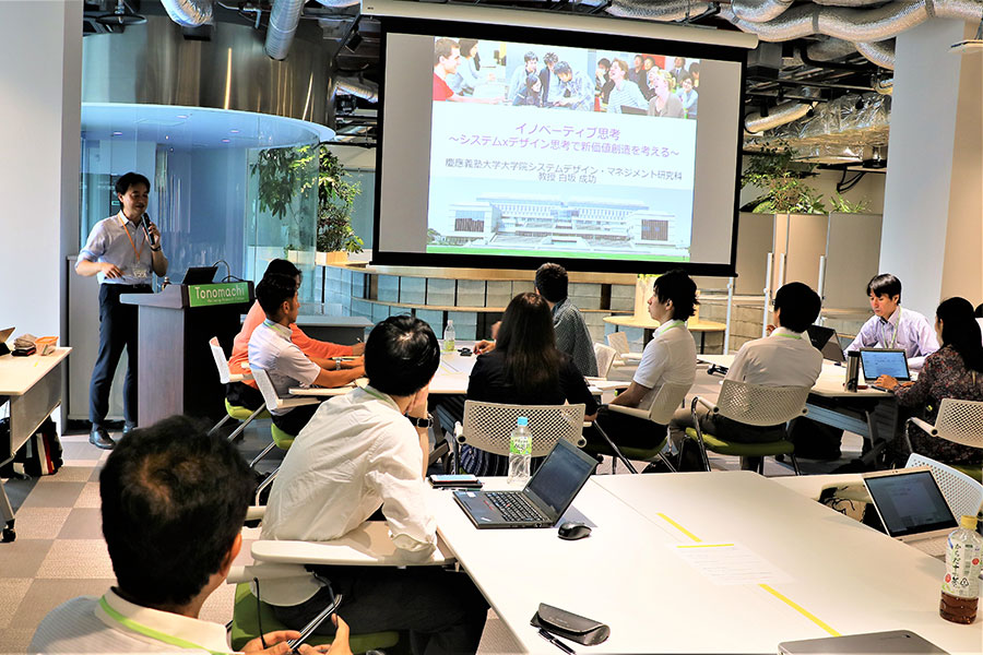 今回は29名の様々な分野で活躍している社会人の方から大学院等で学ばれている方々が受講をされ、初日にまずは慶應義塾大学大学院システムデザイン・マネジメント研究科の白坂教授より本講座開講にあたっての基本的な考え方、手法等に関して解説を頂き、午後よりグループワークを開始いたしました。初日のチームビルディングから始まり、イノベーティブ思考の基礎とヘルスケア領域を対象とした課題の捉え直し、新しい価値創造の提案、グループワークでの成果発表を行いました。最終日には受講者全員に修了証を授与致しました。
